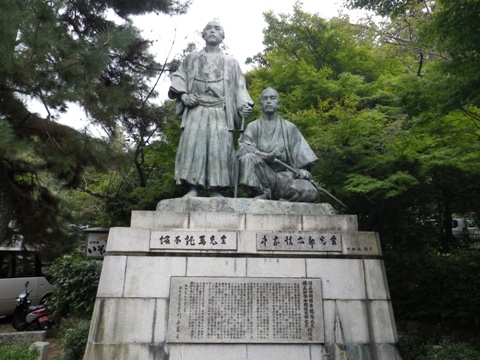 丸山公園内の坂本龍馬・中岡慎太郎の銅像を見て、