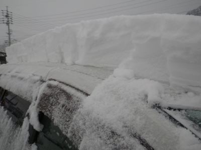 夕方、駐車場に帰ってみると、車が雪に埋もれていてこのとおり。