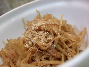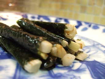 ごま油で炒めたウドに塩を振り、海苔で巻くだけ。