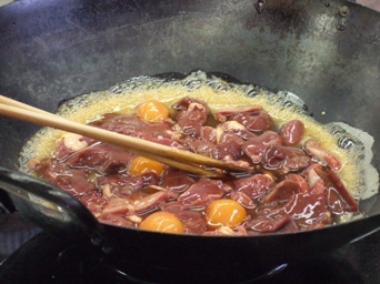 フライパンなどに醤油と砂糖を入れ火にかけ、沸騰したらレバー類を入れ