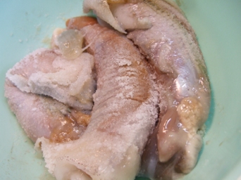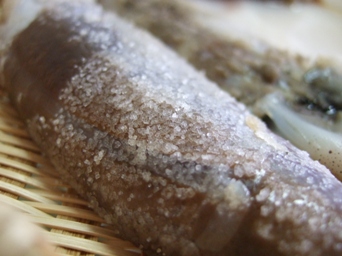 余分なハラワタ等を取り除いたら、塩を全体にまぶします。